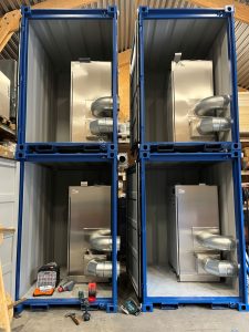 Utslippsfri byggtørking fra F-Tech Utleie kommer i form av komplette anlegg i container, klare for tilkobling til ventilasjonskanaler.