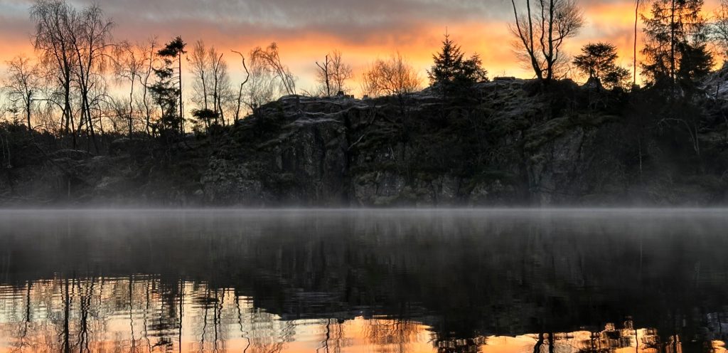 Eget foto av kald morgen med synlig damp fra innsjø i Alvøen